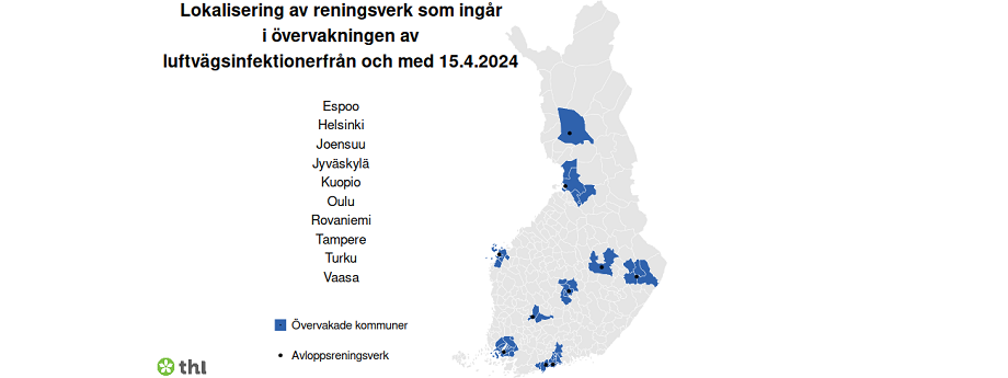 Förekomsten av coronavirus i orenat avloppsvatten rapporteras 1-4 gånger I månaden från Esbo, Helsingfors, Joensuu, Jyväskylä, Kuopio, Tammerfors, Uleåborg, Rovaniemi, Åbo, Vasa.