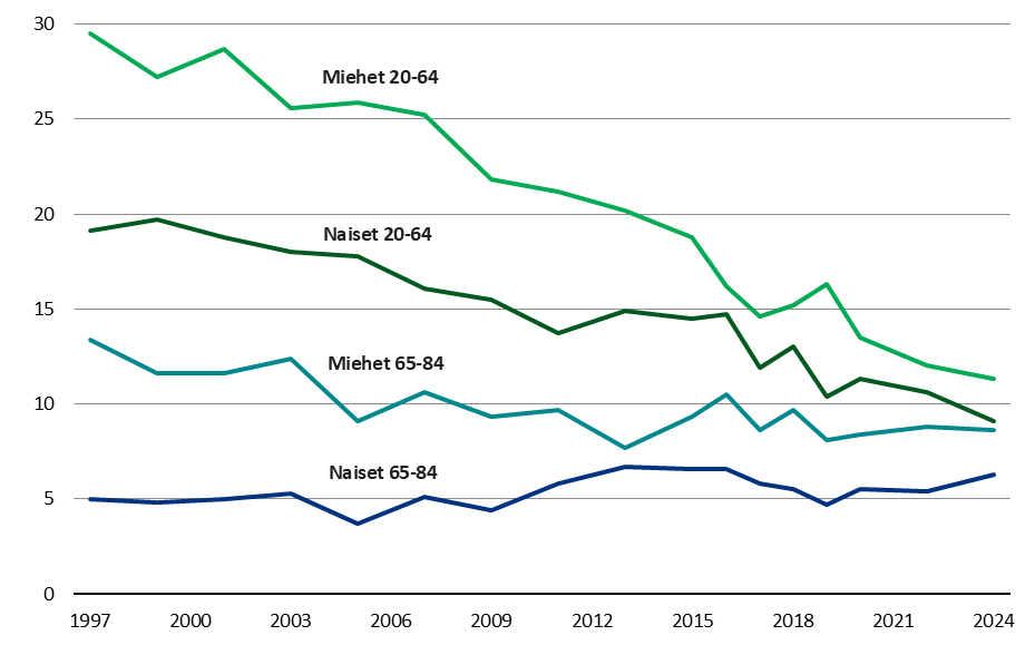 Eläkeikäisistä (65–84-vuotiaat) naisista kuusi prosenttia ja miehistä yhdeksän prosenttia tupakoi päivittäin vuonna 2024. Nikotiinipussien käyttö on yli 64-vuotiailla vähäistä.