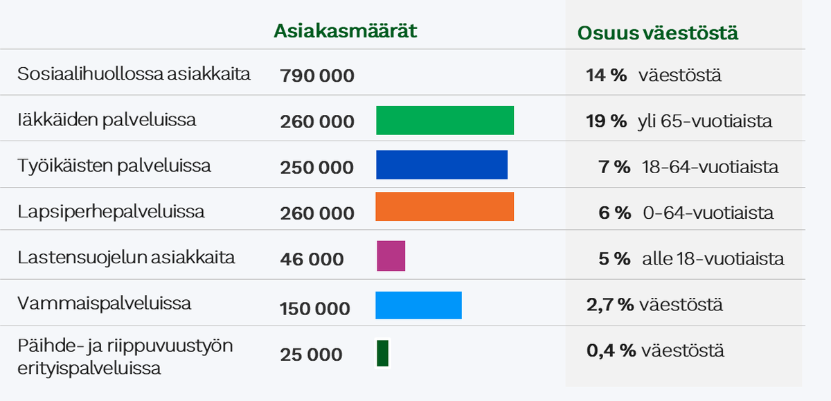 Sosiaalihuollossa arvioitiin olleen noin 790 000 asiakasta kolmannella vuosineljänneksellä (heinä-syyskuu) 2025. Tämä oli 14 prosenttia väestöstä.