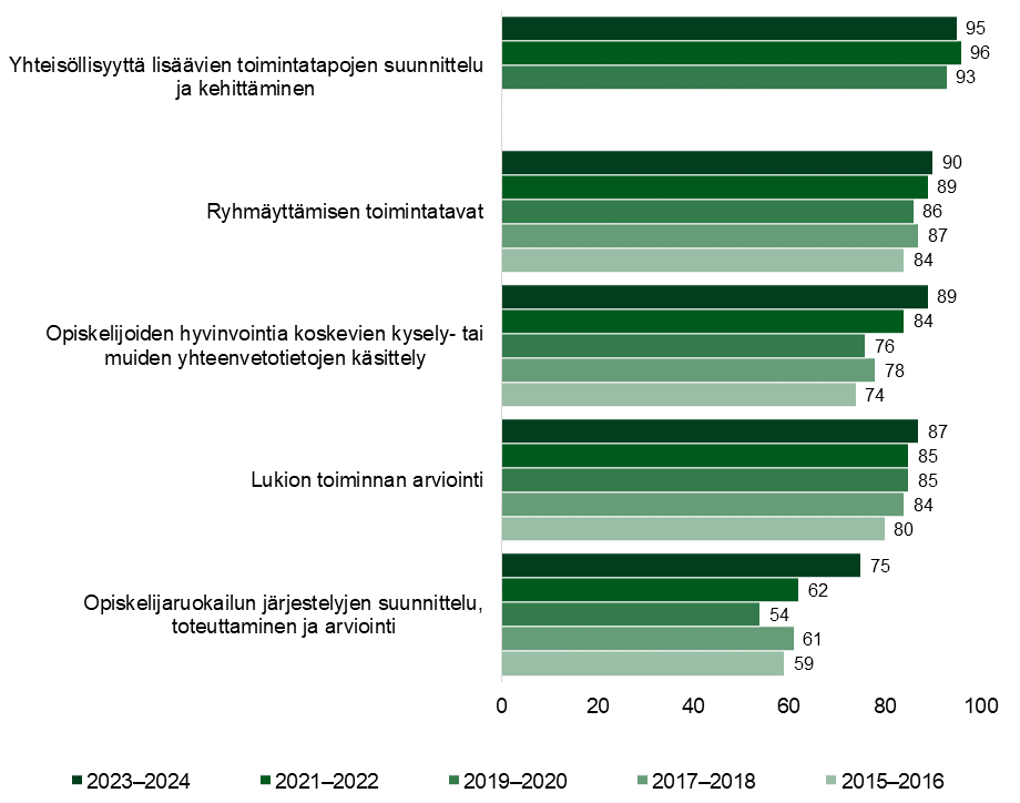 Lukioiden hyvinvointia ja terveyttä edistävä työ on kehittynyt myönteisesti edelliseen, vuoden 2022, tiedonkeruuseen verrattaessa. Opiskelijoiden osallistuminen lukion toiminnan suunnitteluun, kehittämiseen ja arviointiin oli yleistynyt. Myös hyvinvoinnin edistämisen eri teemojen yhteiset kirjatut käytännöt ja toimintaohjeet olivat hieman yleistyneet. Liikkumista opiskelupäivään lisäävät toimenpiteet olivat lukioissa käytössä aiempaa useammin. Opiskeluhuoltoryhmät kokoontuivat hieman aiempaa useammin. Myös yksittäisen opiskelijan asioiden käsittely lukioiden opiskeluhuoltoryhmissä oli selkeästi vähentynyt aiempiin vuosiin verrattaessa.