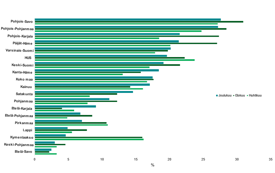 Kuvio 2. Yli puoli vuotta kiireetöntä hoitoa odottaneiden osuus hyvinvointialueiden sairaaloihin odottavista vuonna 2024 (%) (huhtikuussa, elokuussa ja joulukuussa).