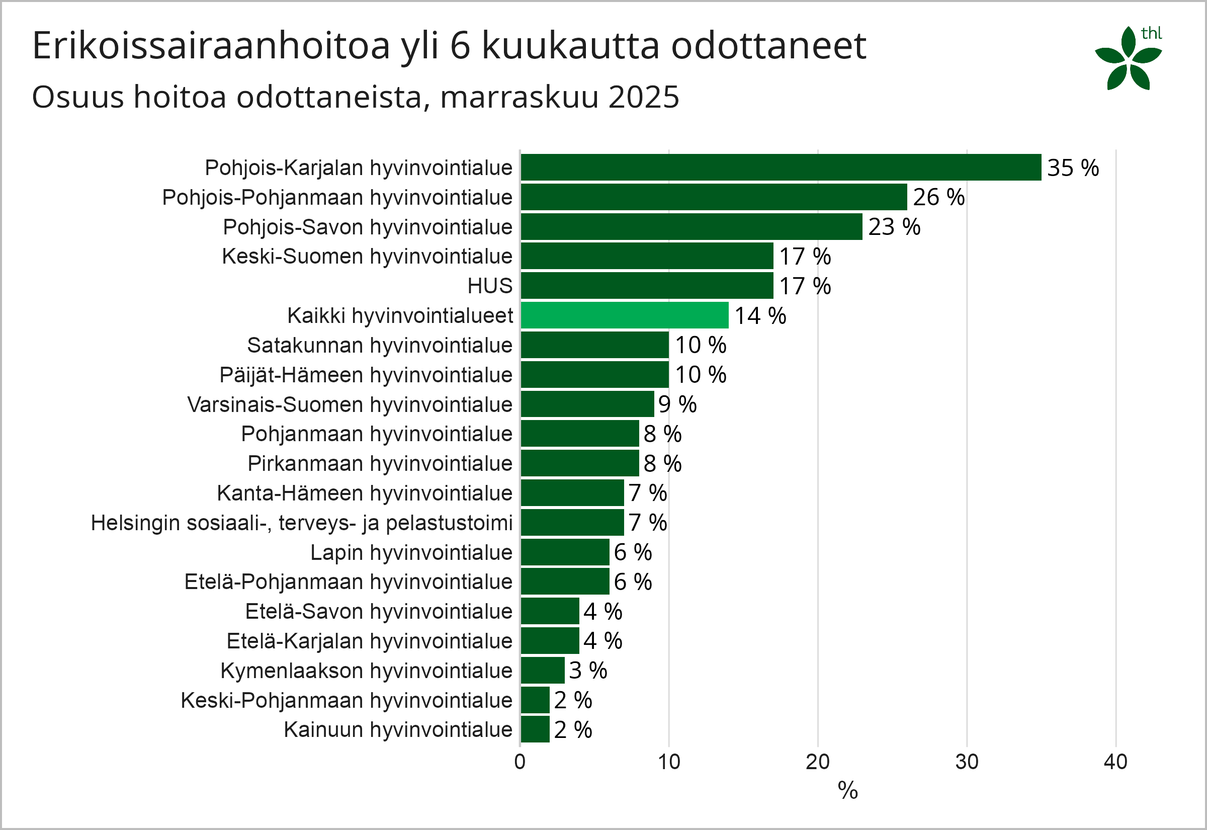 Kuvio 1. Erikoissairaanhoitoa yli 6 kuukautta odottaneiden osuus hoitoa odottaneista marraskuussa 2025.