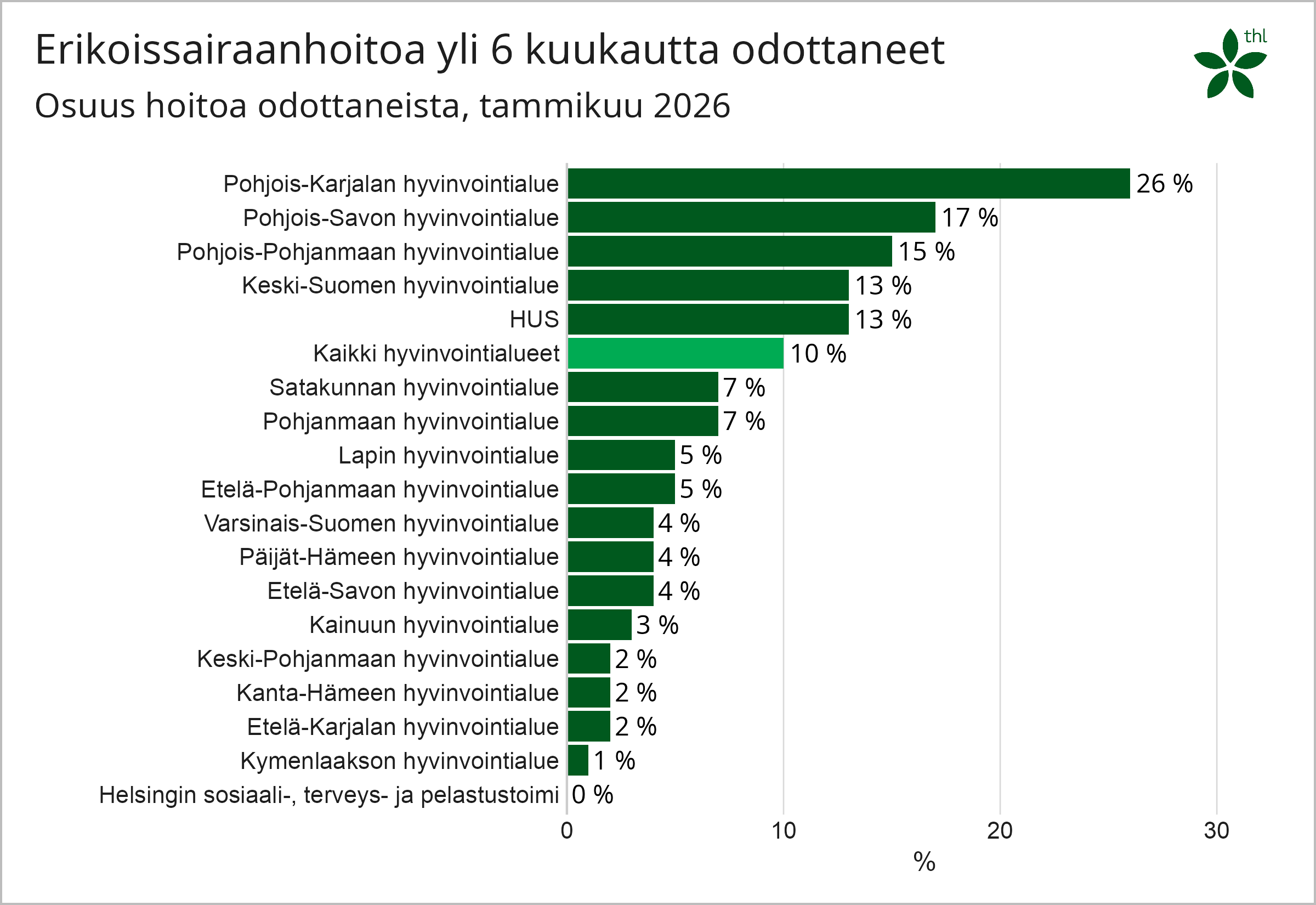 Erikoissairaanhoidon hoitoonpääsyn tammikuun 2026 tiedot on julkaistu niiltä osin kun tiedot ovat olleet saatavilla. Pirkanmaan hyvinvointialueen tiedot joulukuun 2025 ja tammikuun 2026 osalta teknisten haasteiden vuoksi. Julkaisemme tiedot puuttuvilta osin heti kun ne saamme.
