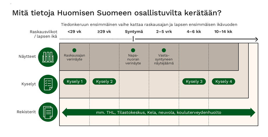 Huomisen Suomessa hyödynnetään odotusaikana ja lapsen syntymän yhteydessä kerättäviä näytteitä ja mittauksia. Lisäksi lapsen odotusaikaa ja elämänvaiheita kartoitetaan kyselyillä ja erilaisista kansallisista rekistereistä saatavin tiedoin.