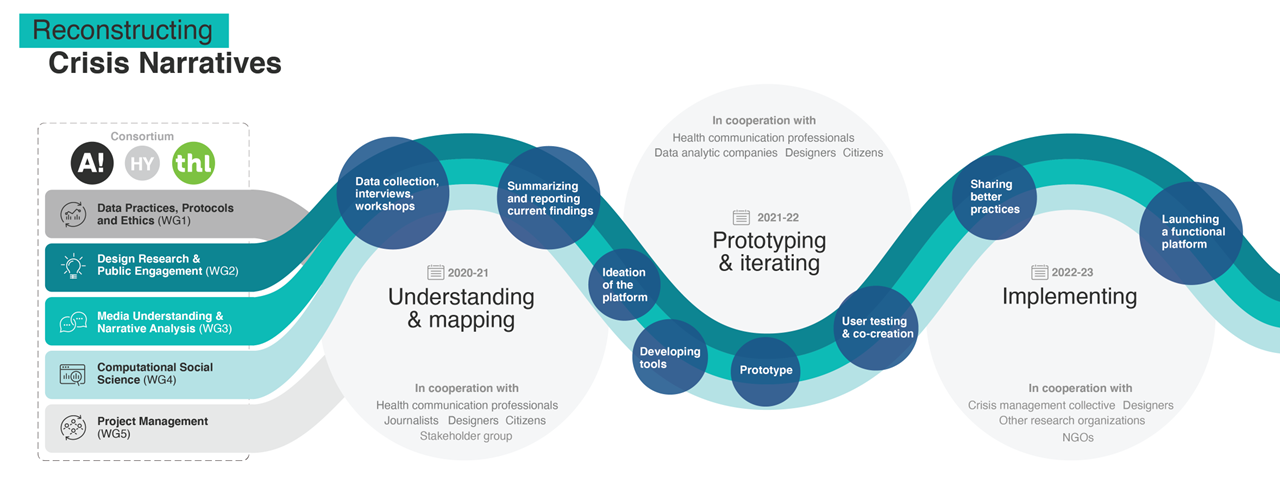 Kriisinarratiivit -hankkeessa analysoidaan kriiseihin liittyviä kertomuksia monimenetelmällisellä otteella. Lisäksi tutkimuksessa suunnitellaan alustaa, joka mahdollistaa kriiseihin liittyvien narratiivien käsittelyn päätöksentekijöiden, asiantuntijoiden, viestinnän ja kriisinhallinnan ammattilaisten työn tueksi.