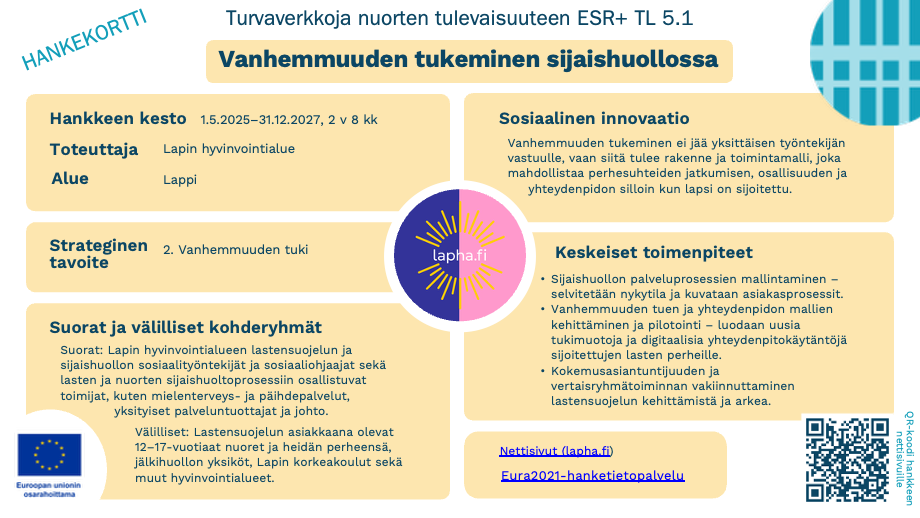 - Vanhemmuuden tuen ja yhteydenpidon mallien kehittäminen ja pilotointi – luodaan uusia tukimuotoja ja digitaalisia yhteydenpitokäytäntöjä sijoitettujen lasten perheille.